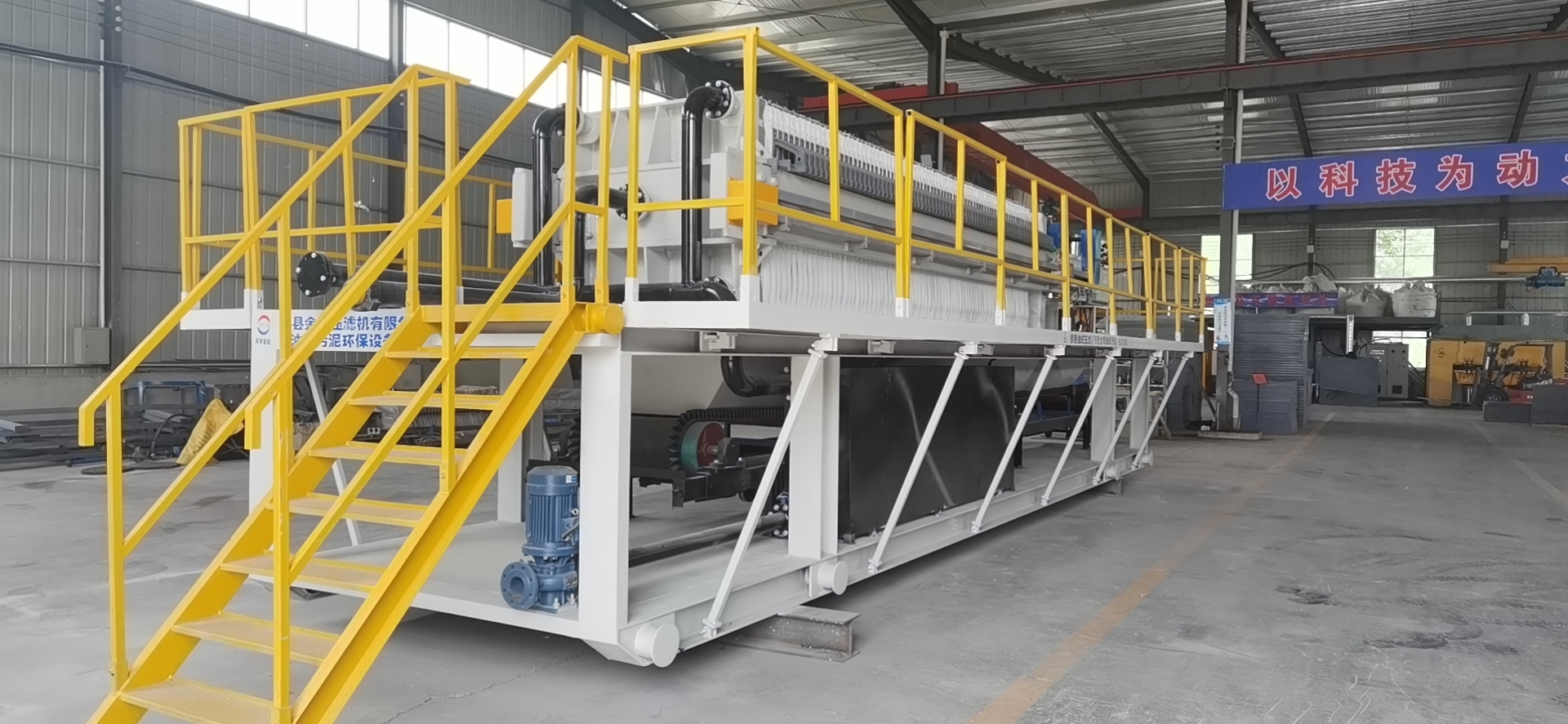 石油钻井污泥处理压滤机是集操作平台、运输设备、输泥斗、抬高架、压滤机于一体的压滤设备。整个处理过程中对污泥的切割粉碎、进料、排泥、输送,絮凝剂的投加以及对整个系统运行状况的监控,均由PLC+液晶屏的控制系统来实施,并且此设备便于吊装运输,方便钻井现场的转移和运输。对用户而言,该装置作为全自动化的成套操作单元,是一款真真正正省时省力的全自动设备。